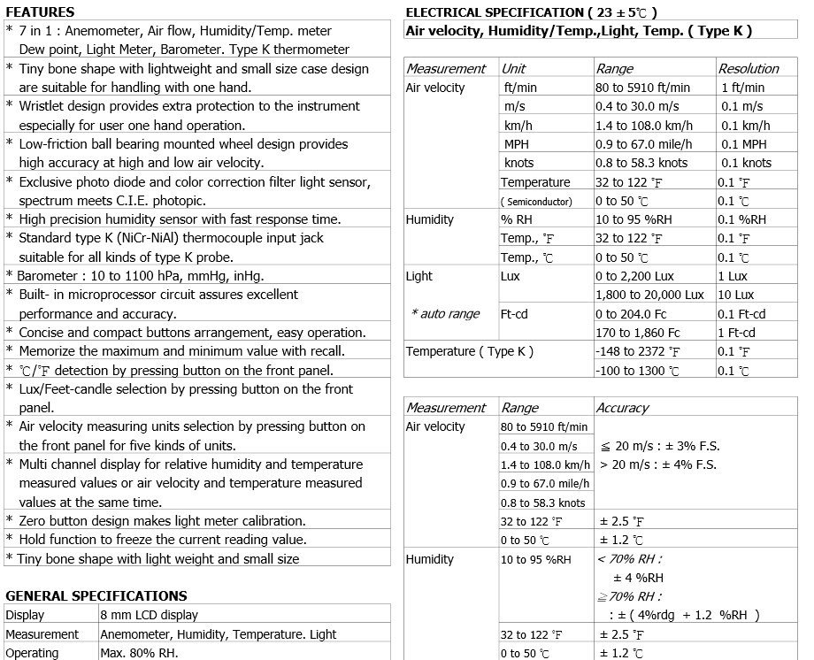 LUT0322-7 IN 1 BAROMETER/LIGHT/RH/TEMP/AIRFLOW Multifunction Meter