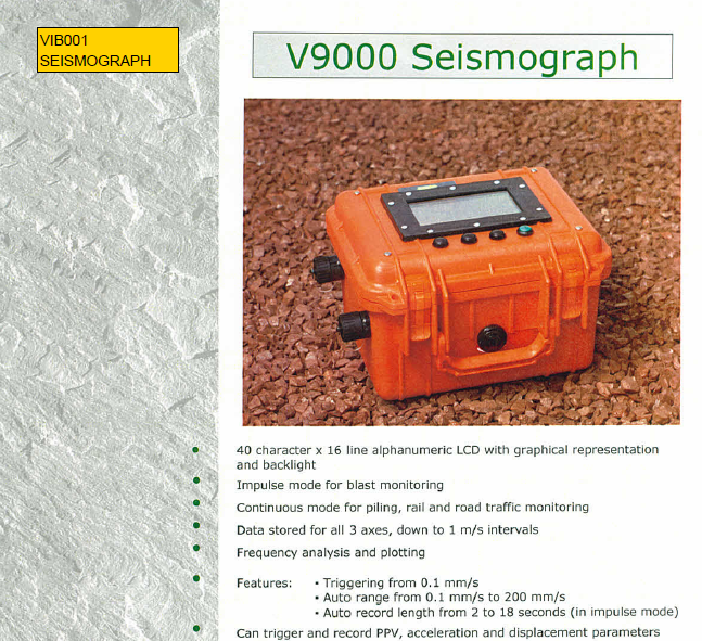The all new V9000 Seismograph is designed and manufactured by Vibrock Ltd to meet the needs of our customers. The V9000 Seismograph is a battery powered portable vibration monitor, designed for monitoring blasting, piling, demolition, construction and traffic vibrations. It can also monitor dominant frequencies as well as air overpressure from blasting, using the optional microphone.