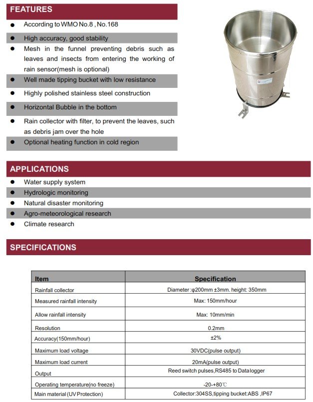 The RKA003 Automatic Rainfall Station is used to measure and record rainfall information. The LCD display can show the real time rainfall value, time & date. Large-capacity FLASH memory chips can automatically stored at least one year of meteorological data. Data logger is equipped with three types of communication interfaces (RS232 / RS485 / USB) which establish communication with the computer. Data of rainfall can be observed remotely through the supporting PC software. Meteorological weather data can be further processed and analyzed by the data logger.The station can be equipped with rainfall sensor.