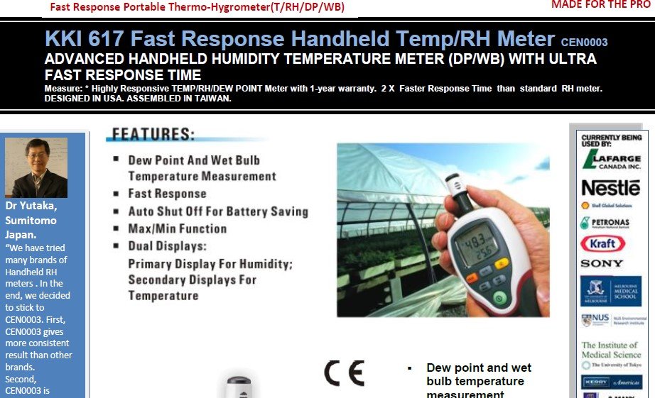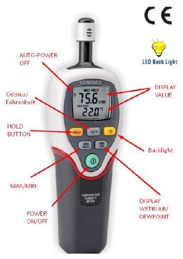 You are here: Home Products Humidity meters (Hygrometers) Portable humidity meters CEN0003-617 Fast Response Handheld Tempeature / Relative Humidity Meter ((T/RH/DP/WB)